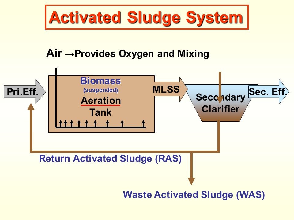 تعتمد عملية المعالجة بالحمأة المنشطة على البكتريا والكائنات الحية الهوائية التى يلزم لحياتها توفر الأكسجين المذاب. ولكى تضمن استمرار العملية بكفاءة يجب الاحتفاظ بمقدار 2.5 مليجرام /لتر أكسجين ذائب فى محتويات حوض التهوية وحوالى ثلث مليجرام /لتر فى الحمأة المعادة من المروق الثانوى إلى أحواض التهوية. كما يجب قراءة الاكسجين الذائب في الاماكن الصحيحة المناسبة في حوض التهوية قراءة صحيحى دقيقة.