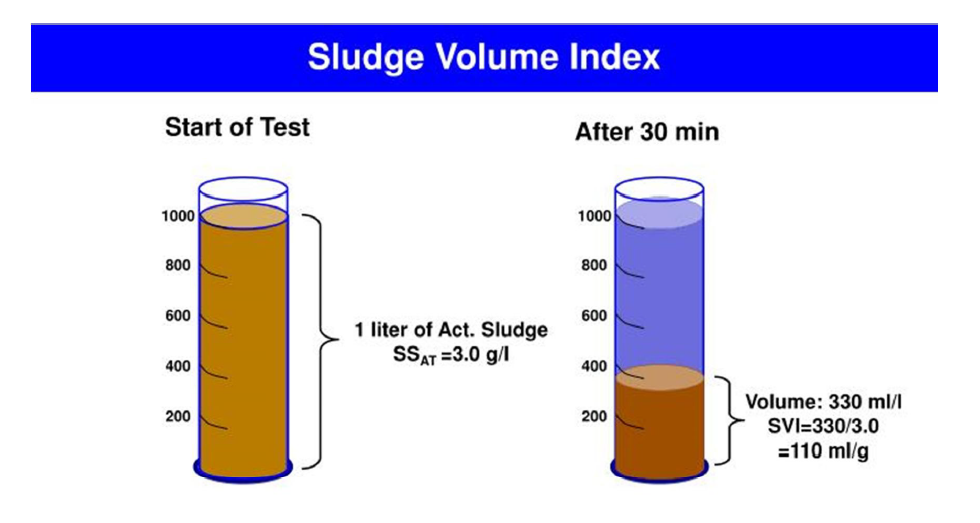 إذا أخذنا عمينة من السائل المخلوط من أحواض التهوية ووضعناها فى مخبار مدرج إلى علامة اللتر، تبدأ الرواسب فى النزول إلى أسفل وبعد 30 دقيقة من الزمن نلاحظ أن حجم ما ترسب فى قاع المخبار يختلف باختلاف العينات.