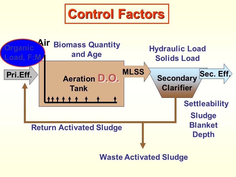 ويبين الشكل التالي بعض العوامل المؤثرة والمتحكمة في كفاءة المعالجة البيولوجية لمياه الصرف بالحمأة المنشطة.