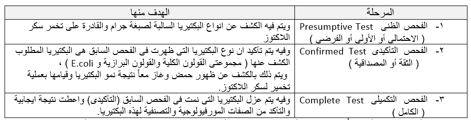 ويجب أن نوضح هنا أنه طبقاُ للمعايير الدولية والمواصفات القياسية فانه عند اختبار عينات مياه الشرب لابد أن يتم اجراء الكشف عن مجموعة بكتيريا القولون الكلية ومجموعة بكتيريا القولون البرازية للتأكد من سلامة مياه الشرب وصلاحتيها للاستهلاك الادامى، لذلك فى حالة اختبارعينات مياه الشرب (بشرط اجراء اختبار المجموعة القولونية البرازية ) يتم اجراء الفحص الظنى والتأكيدى فقط ولا يتم عمل الاختبار التكميلى (لأن اختبار المجموعة القولونية البرازية حل محله) لذلك سنكتفى بتوضيح المرحلة والثانية فقط فى هذه المقالة.