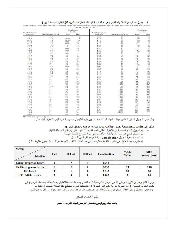 اختبارالعدد الأكثر احتمالا(MPN) للكشف عن مجموعة بكتيريا القولون الكلية ومجموعة القولون البرازية فى مياه الشرب :