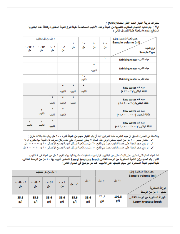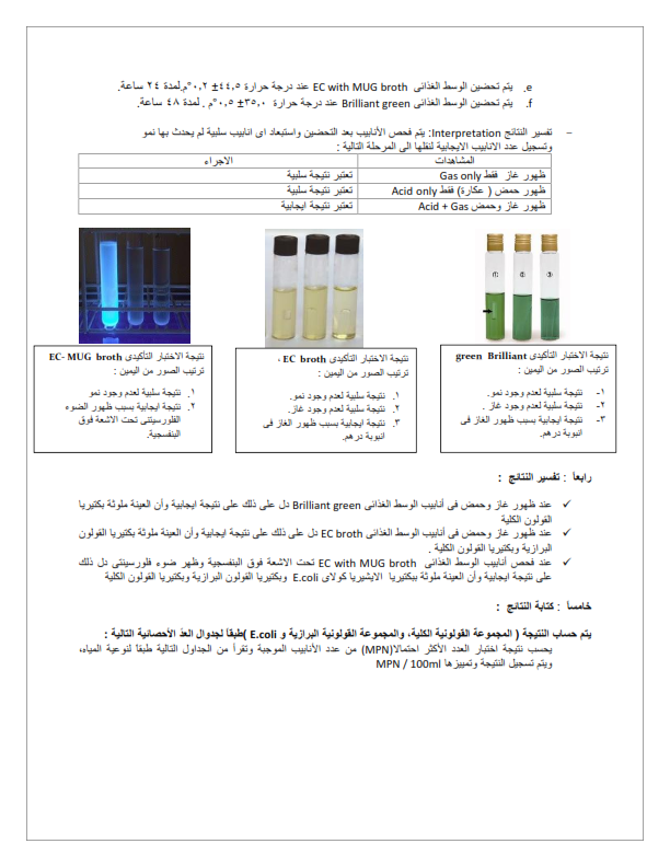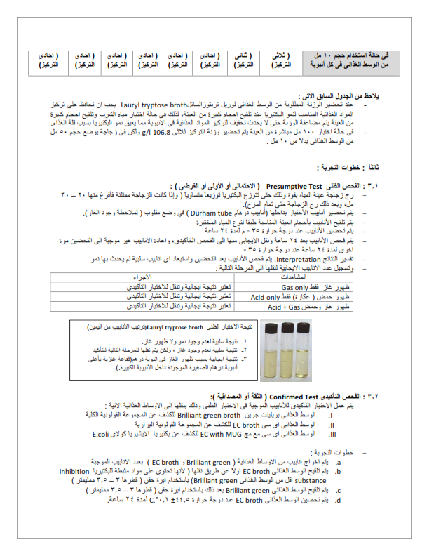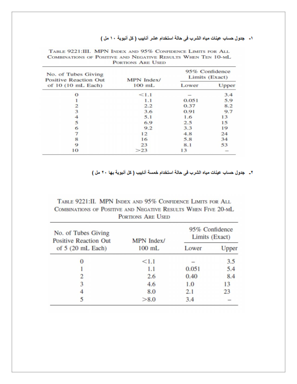 اختبارالعدد الأكثر احتمالا(MPN) للكشف عن مجموعة بكتيريا القولون الكلية ومجموعة القولون البرازية فى مياه الشرب :