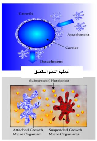 لاسطوانة الوسطى من المفاعل والتي بداخلها مصدر للهواء حيث تتشبع المياه بالأكسجين تماما ثم تخرج بفعل قوة الخلط الشديد مع الهواء من أعلى الاسطوانة وكأنها نافورة مياه لتدخل إلى المفاعل الحيويى حول الاسطوانة الوسطى حيث توجد المواد الحاملة Carriers والتي تم تطويرها وتصميمها بأسلوب خاص بحيث تقوم البكتيريا بعمل تحلل لا أكسجينيAnoxic Decomposition على السطح الداخلي للحامل ويحدث تحلل هوائي Aerobic على السطح الخارجي المموج مما ينتج عنه معالجة بدرجة سريعة وفعالة للمياه, ويمتاز هذا المفاعل بأن تركيز الكتلة الحيوية Biomass يصل الى (15-30) كجم/م3 مقارنة ب(2.5- 3) كجم/م3 في الأنظمة التقليدية ولايزيد زمن الاختلاط في هذه المرحلة عن (10) ساعات مقارنة ب(24- 36) ساعة في الأنظمة التقليدية.