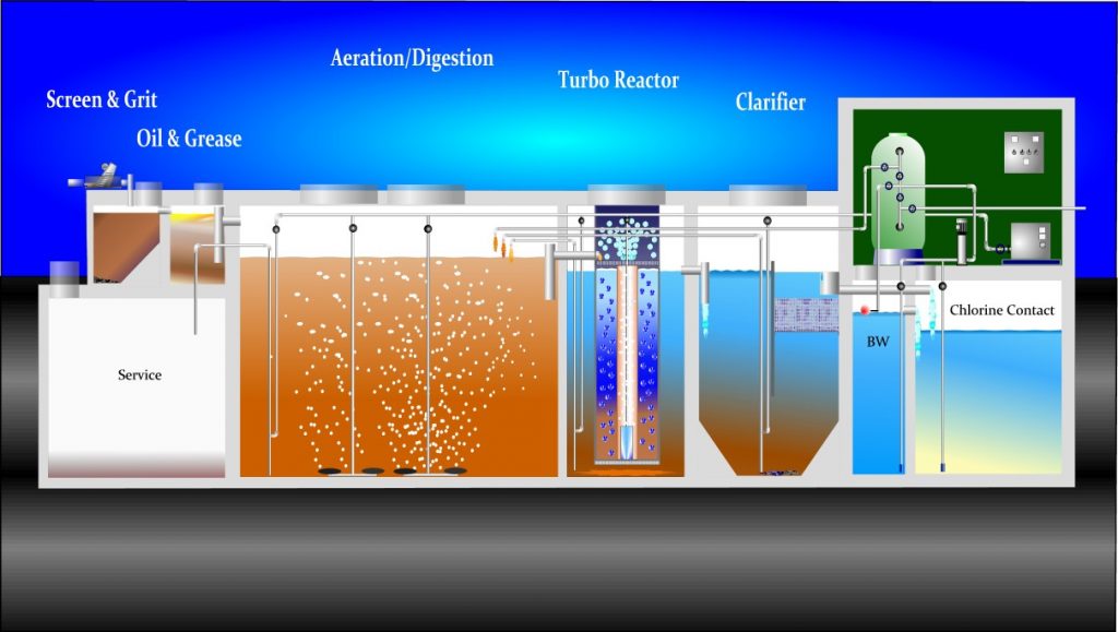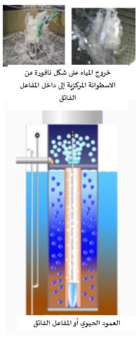 كما هو موضح بالرسم تدخل المياه من حوض التهوية والهضم مشبعة بكمية مناسبة من الأكسجين وبمستوى خلط ملائم للكتلة الحيوية إلى وحدة المفاعل الفائق او العمود الحيوي Turbo Reactor or Bio shaft حيث تدخل المياه الى ا