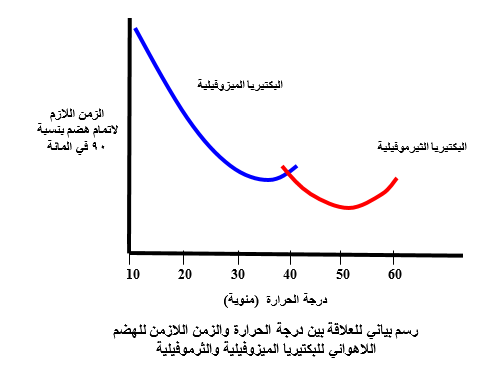 وعموما يتم التحكم في معظم الهاضمات في درجة حرارة من 35 – 37 مئوية وذلك لخطورة وصعوبة التحكم في التخمير الثرموفيلي ( تحتاج لرقابة شديدة لمنع حدوث تسرب وانفجار لغاز الميثان) .ويبين المنحني التالي علاقة الزمن اللازم لاتمام هضم بنسبة 90 في المائة ودرجة الحرارة لكل من البكتيريا المحبة للحرارة المتوسطة (الميزوفيلية ) والبكتيريا المحبة للحرارة المرتفعة ( الثيرموفيلية ).