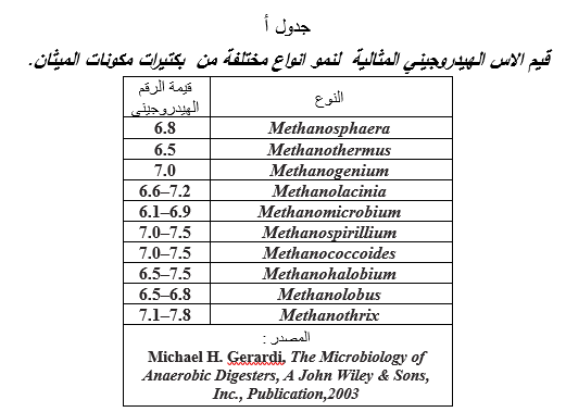 قيمة الآس الهيدروجيني وهي تعبير عن تركيز أيون الهيدروجين والذي يحدد قاعدية او حامضية الوسط المحيط بالبكتريا, واثبتت التجارب العملية الا انه لكي يحدث درجة عالية من التخمير داخل الأحواض فانه يفضل ظبط قيمة الآس الهيدروجيني ما بين 7.0 الي 8.0 , وتقل نشاط البكتريا المسئولة عن التخمير اذا قل الآس الهيدروجيني عن 6.0 ويتوقف التخمير تماما عند قيمة 4.0 , ويمكن ظبط الآس الهيدروجيني بإضافة الجير . ويبين الجدول التالي قيم الاس الهيدروجيني المثالية لنمو انواع مختلفة من بكتيرات مكونات الميثان.
