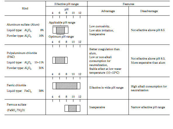 Each inorganic coagulant has the optimum pH, this optimum pH range is the same to the pH range which the metallic ion composed of the coagulant stably precipitates as the hydroxide. For example, aluminum ion stably precipitates as the hydroxide in the pH range of 5.0 to 7.5, and the optimum pH range of alum or PAC is also 5.0 to 7.5.
