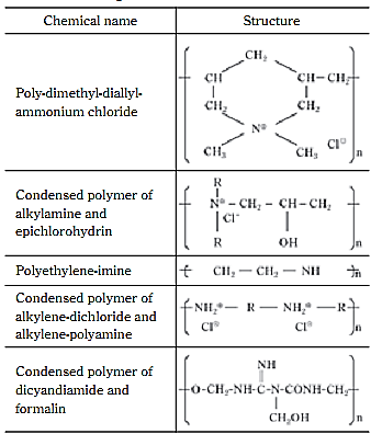 Most organic coagulants are cationic low molecular weight polymers, their cationic functional groups are essentially amine-groups including primary, secondary and tertiary amine-groups, and quaternary ammonium chloride groups.